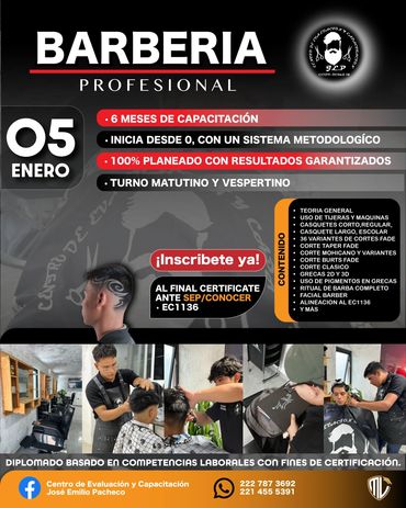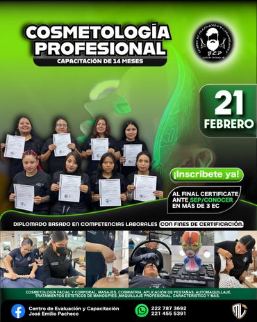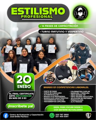 Formar personas íntegras, competentes y comprometidas con su crecimiento personal y profesional, a través de una educación de calidad orientada al desarrollo de competencias laborales certificables. En el Centro de Capacitación José Emilio Pacheco impartimos formación en estilismo profesional, barbería, maquillaje, uñas y cosmetología, así como educación básica y media superior mediante primaria, secundaria abierta y bachillerato general, fortaleciendo conocimientos, habilidades y actitudes alineadas a los Estándares de Competencia del CONOCER, con validez oficial y reconocimiento nacional.